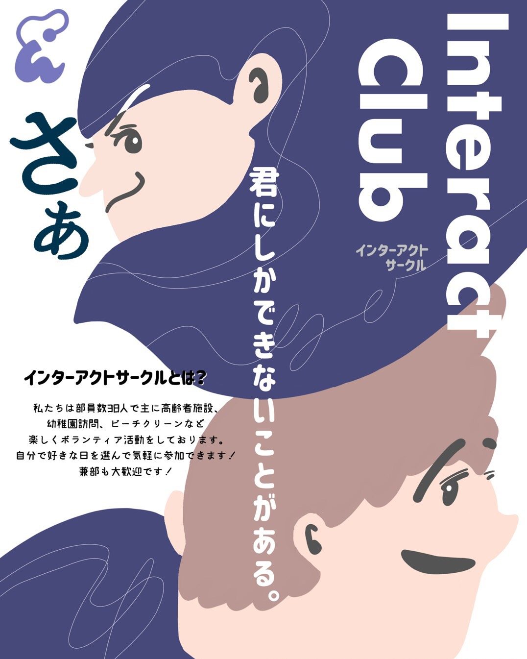 インターアクト同好会は、「ボランティア活動を行いたいけど一人では勇気が出ない」、「ボランティアをするきっかけがほしい」という人の“はじめの一歩”を後押しする同好会です。