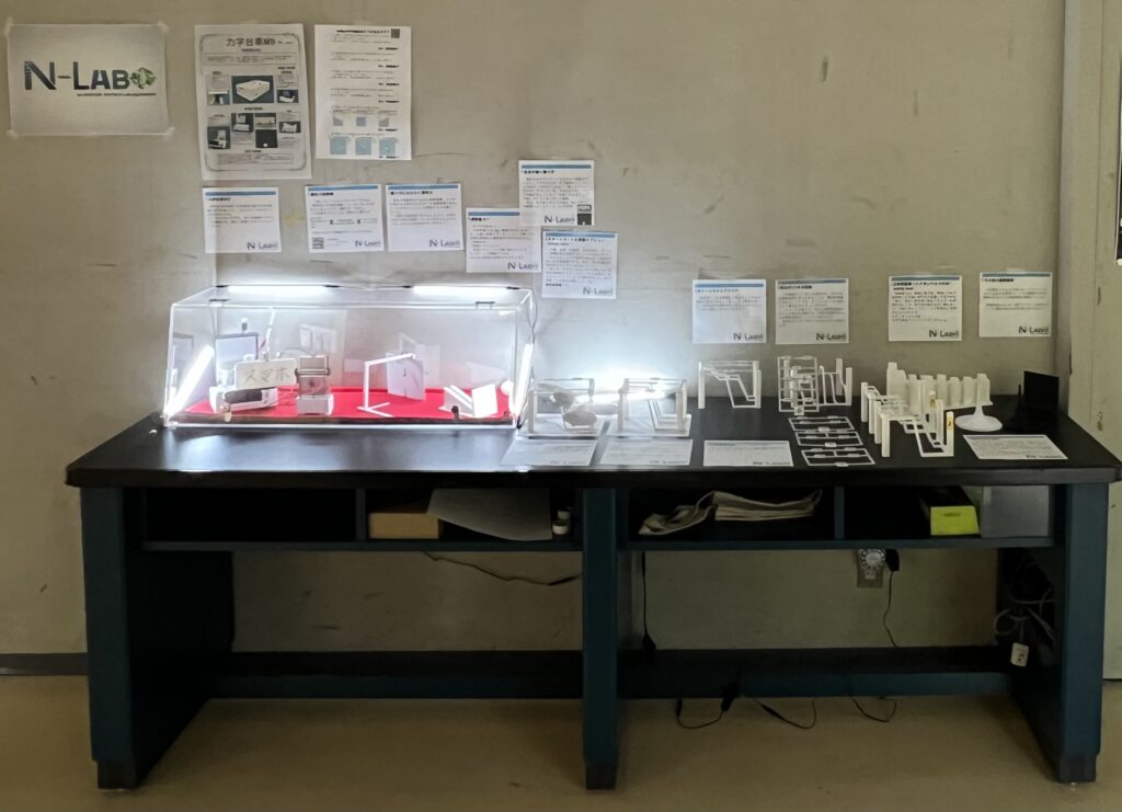 理科実験室前の廊下では、3Dプリンターで作った手作り実験教材の開発・展示を行っています!
